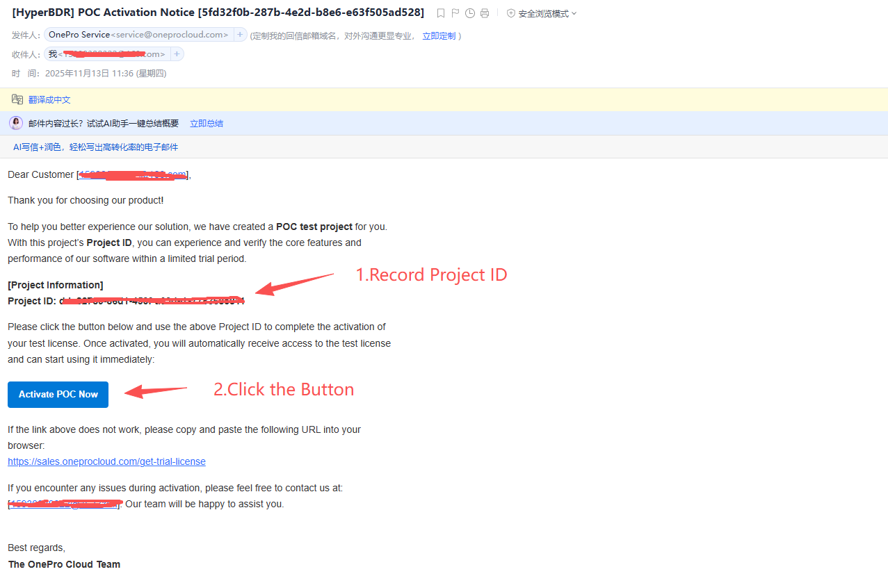 Open the POC authorization notification email, record the Project ID, and click [Activate POC Now] to go to the license activation page.