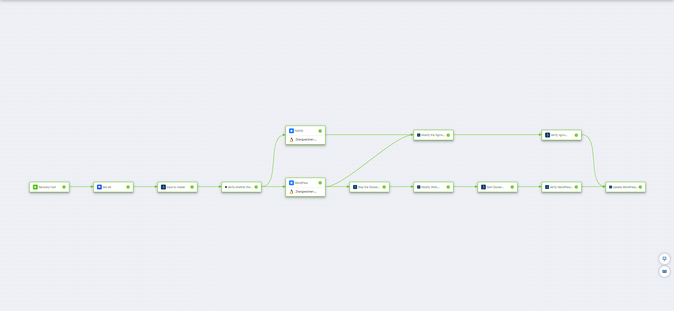 First, we used HyperBDR to provide unified DR protection for two business hosts; subsequently, through HyperBDR's orchestration capabilities, we automated the design of the business recovery process. The following figure shows the overall process effect after orchestration. The specific execution steps are as follows: