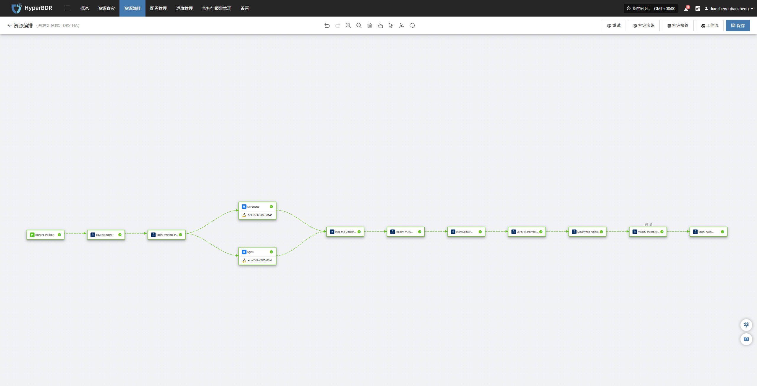 The core objective of HyperBDR's orchestration function is an automated, standardized, and visualized DR switching process . It separates the configuration management of DR resources (hosts, databases, object storage, etc.) from the logic of DR processes (startup sequence, dependencies, verification steps) through the approach of "decoupling resources from processes".