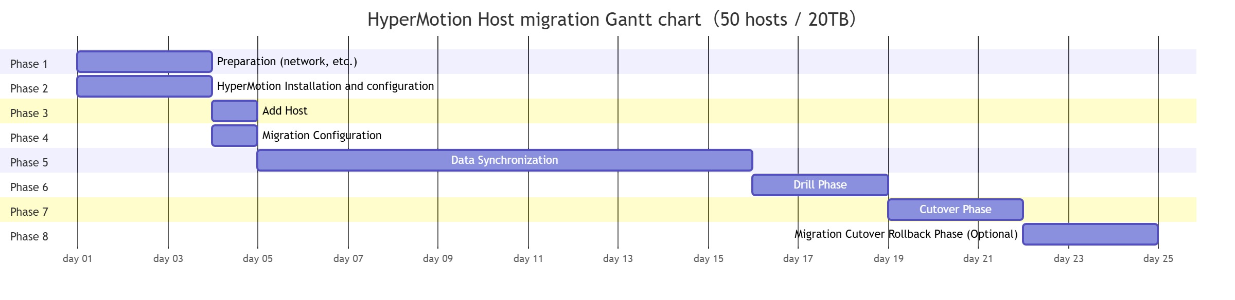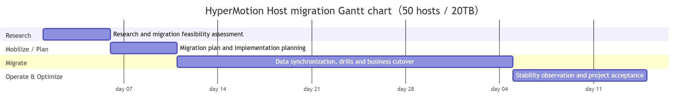| 1 | Migration Preconfiguration | Configure migration parameters for registered hosts in the HyperMotion Console, including storage mode selection, pre-configuration of computing/storage/network resources, and specify the migration strategy to prepare for drills and formal cutovers. | MSP |