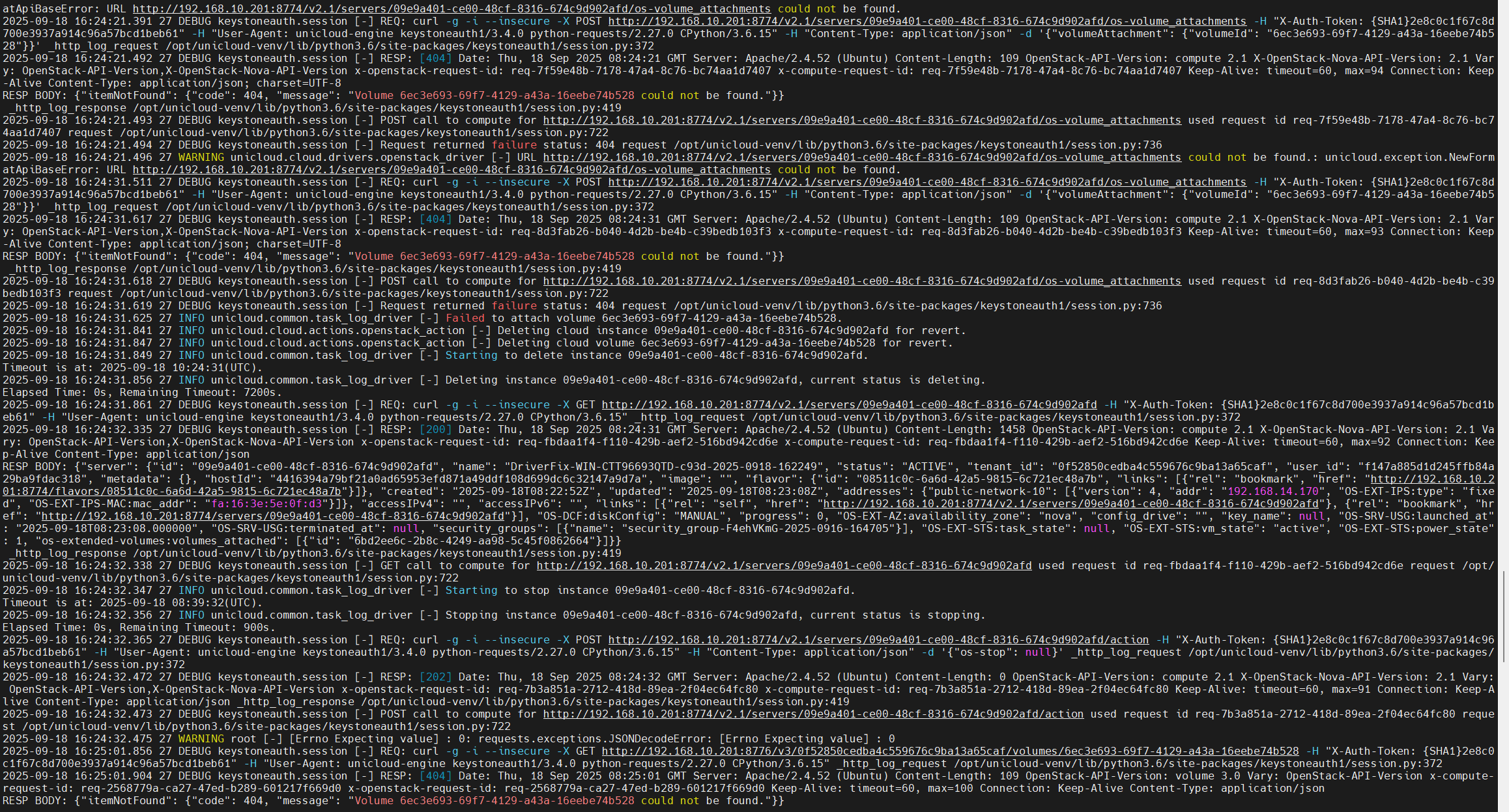 - Nova returns 404 when calling Cinder to attach the volume.