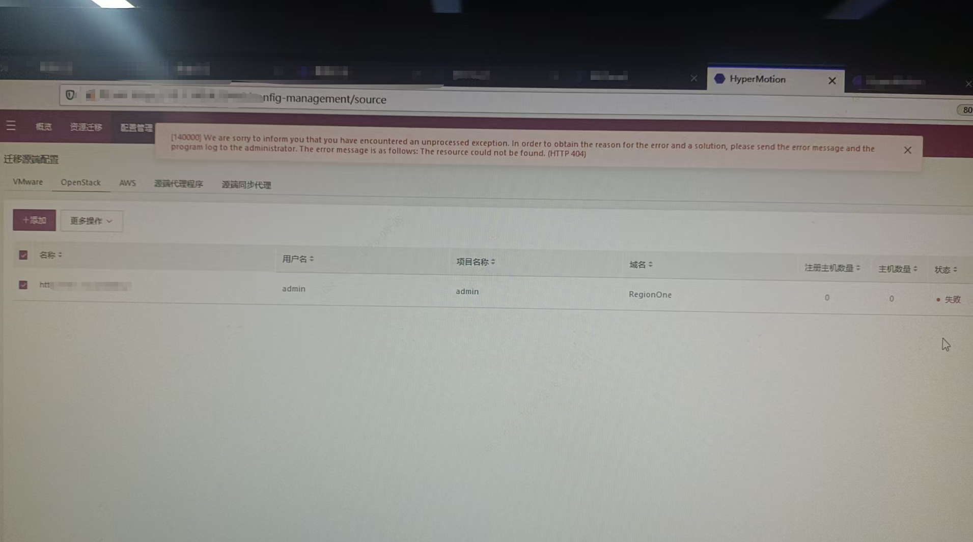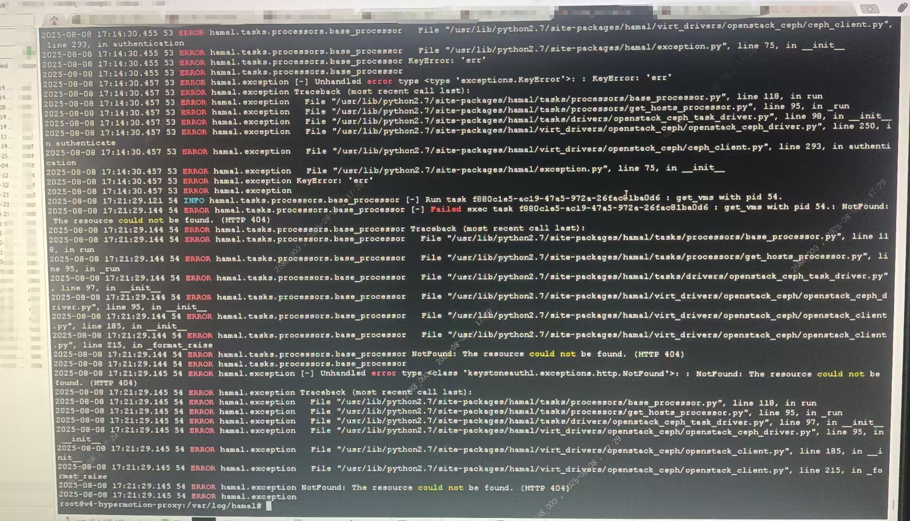 ERROR hamal.exception [-] Unhandled error type <class 'keystoneauth1.exceptions.http.NotFound'>If the current information is insufficient to determine the root cause, contact the OnePro team for deeper analysis and support.