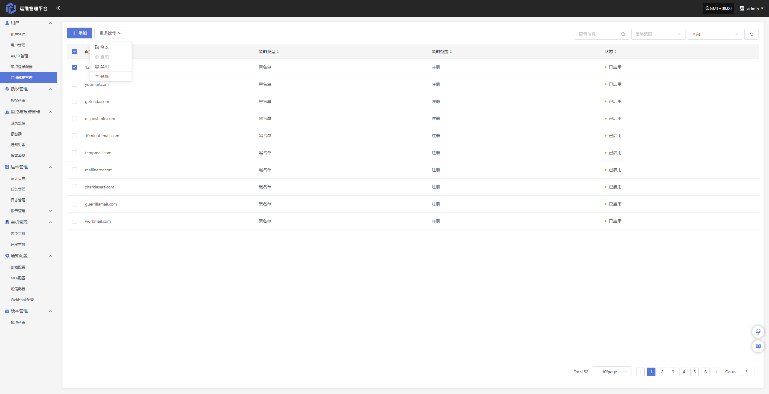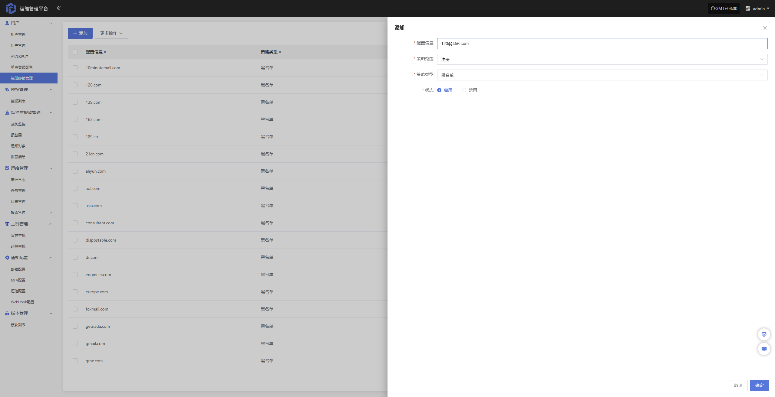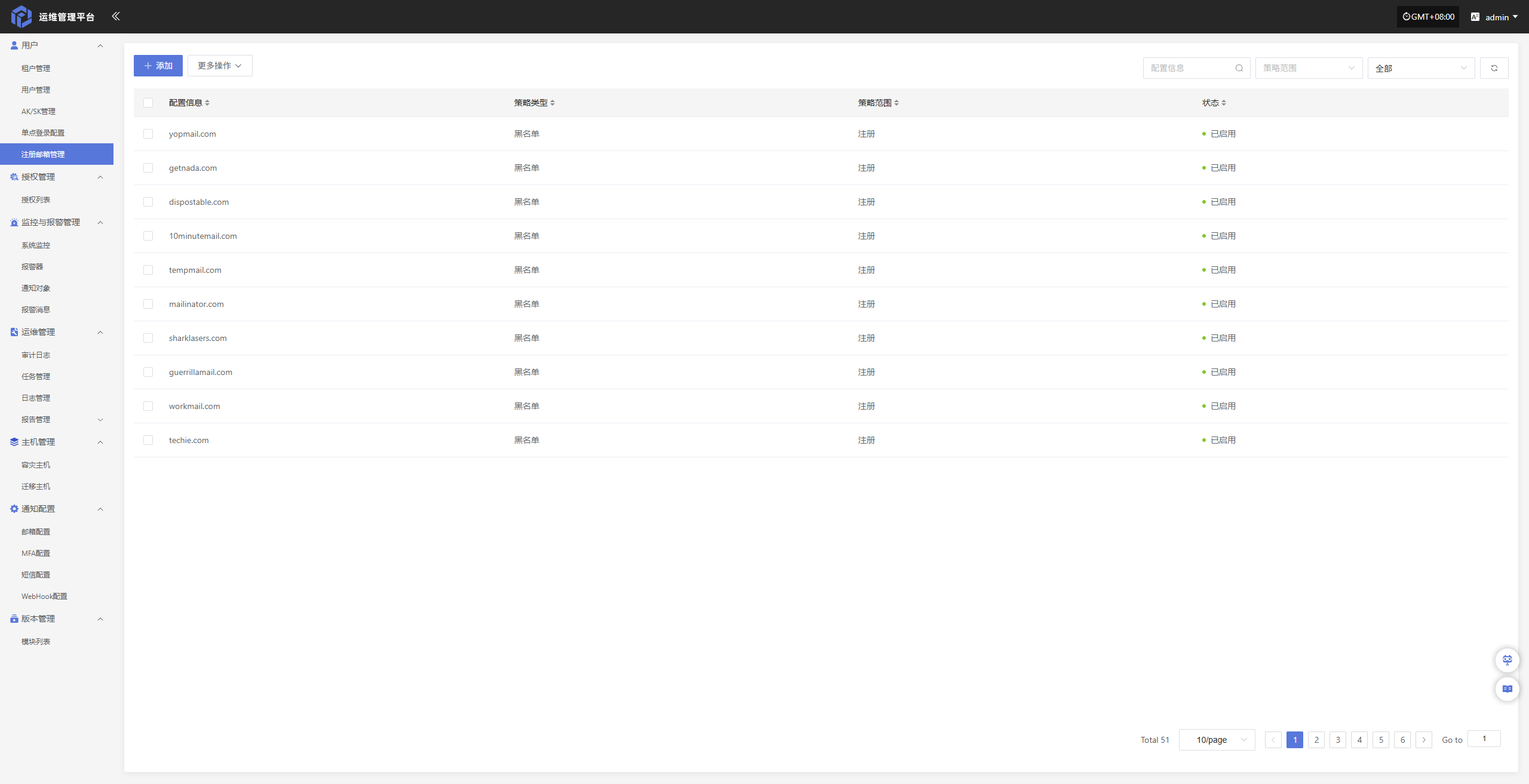 该功能用于对用户注册所使用的邮箱进行黑名单管理。管理员可将指定邮箱或邮箱域名加入黑名单,加入后将禁止使用该邮箱或域名进行注册。