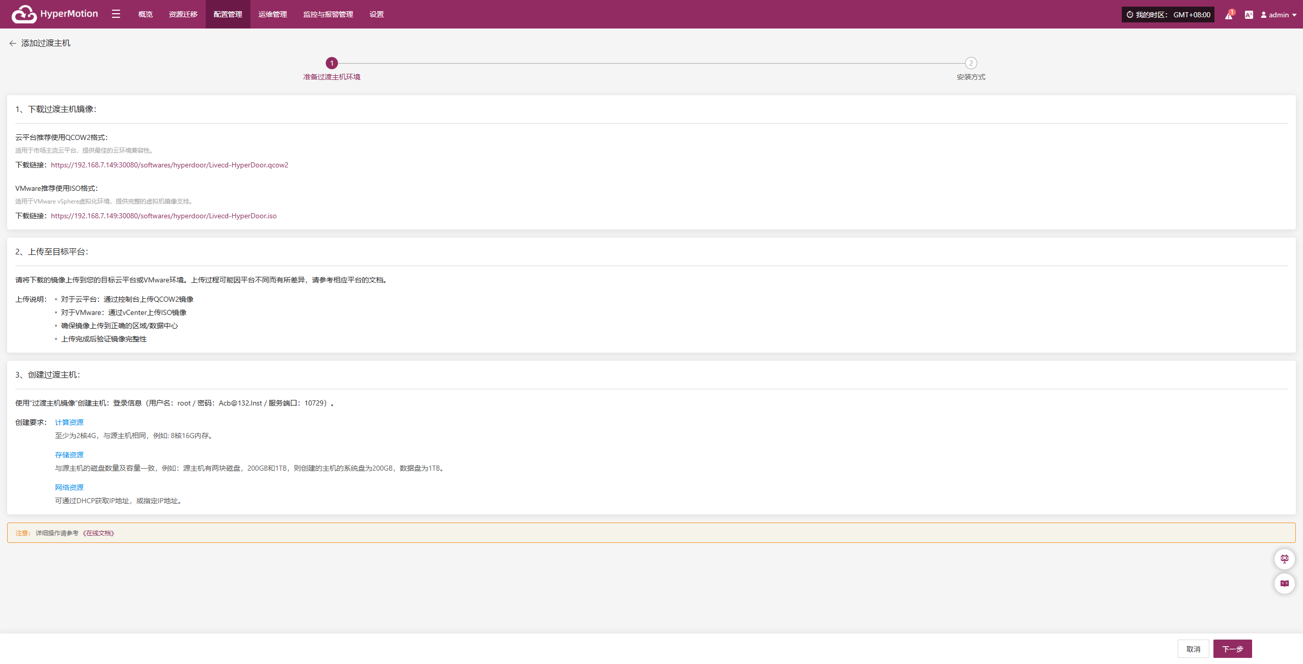 请在目标云平台资源准备完成后,点击‘下一步’以继续配置流程。系统提供两种安装方式,用户可根据页面提示选择任意一种完成配置。