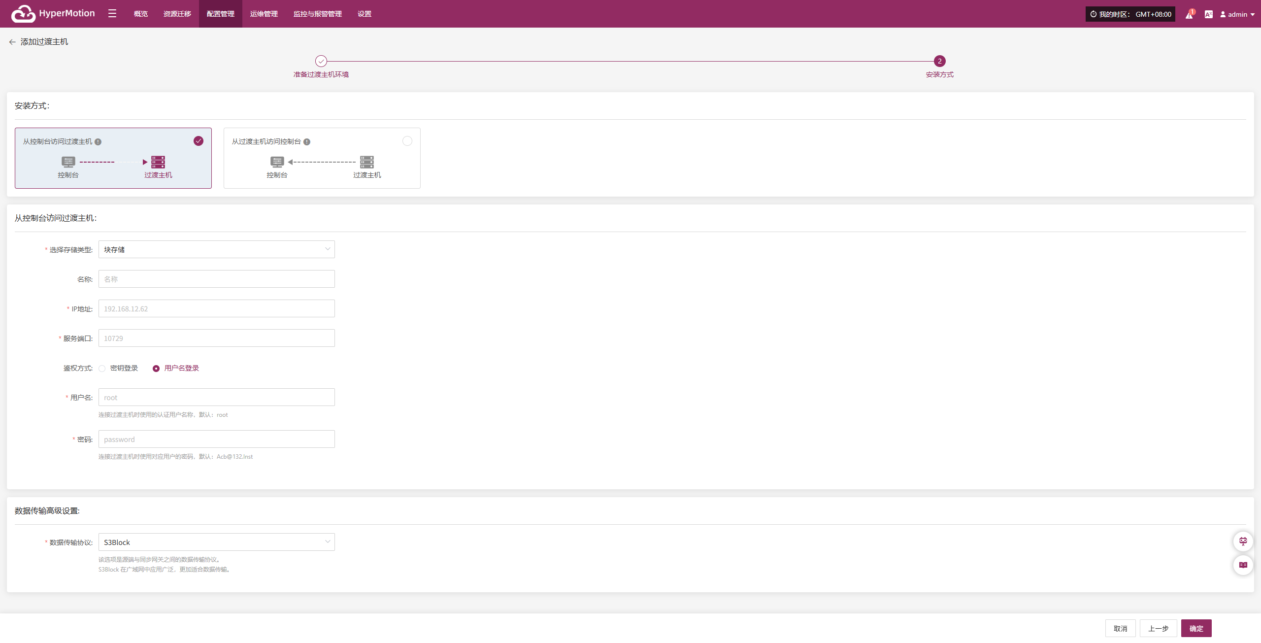 在配置窗口中,选择存储方式并填写临时过渡主机信息,如名称、IP 地址、服务端口等。