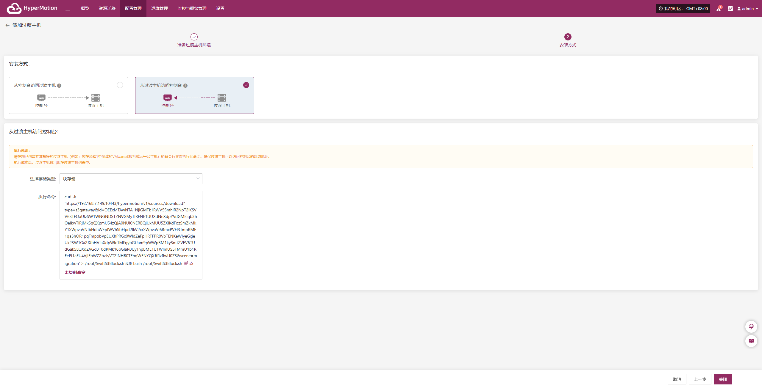 请在您已创建并准备好的过渡主机(例如:您在“添加过渡主机”步骤中创建的VMware虚拟机或云平台主机)的命令行界面复制并执行此命令。确保过渡主机可以访问控制台的网络地址。
