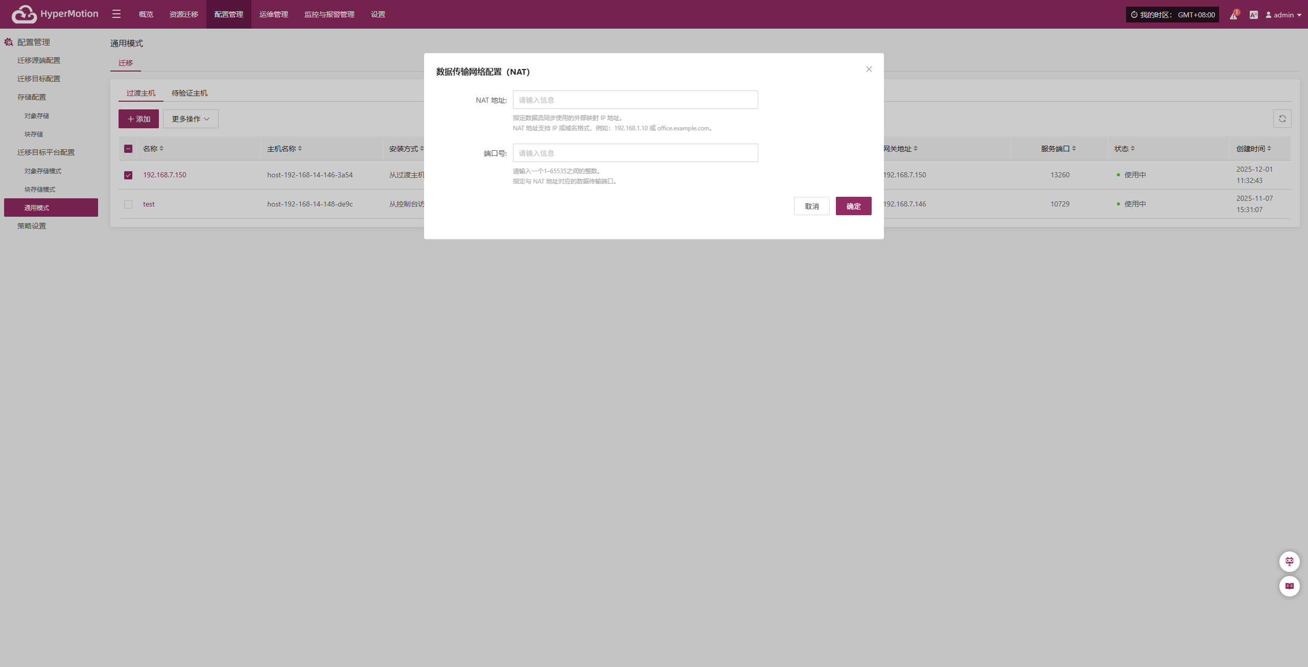 根据网络结构配置主机 NAT 映射地址,完成添加,确保数据流量可正常传输。