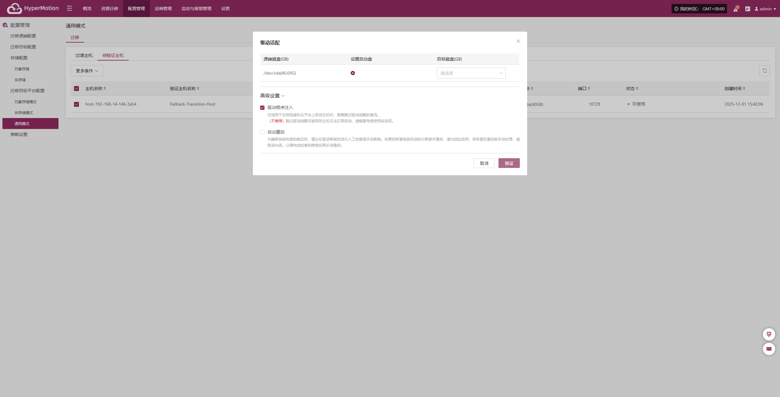 选中目标主机后,点击【更多操作】 > 【驱动适配】,可向该过渡主机注入必要驱动,完成主机恢复