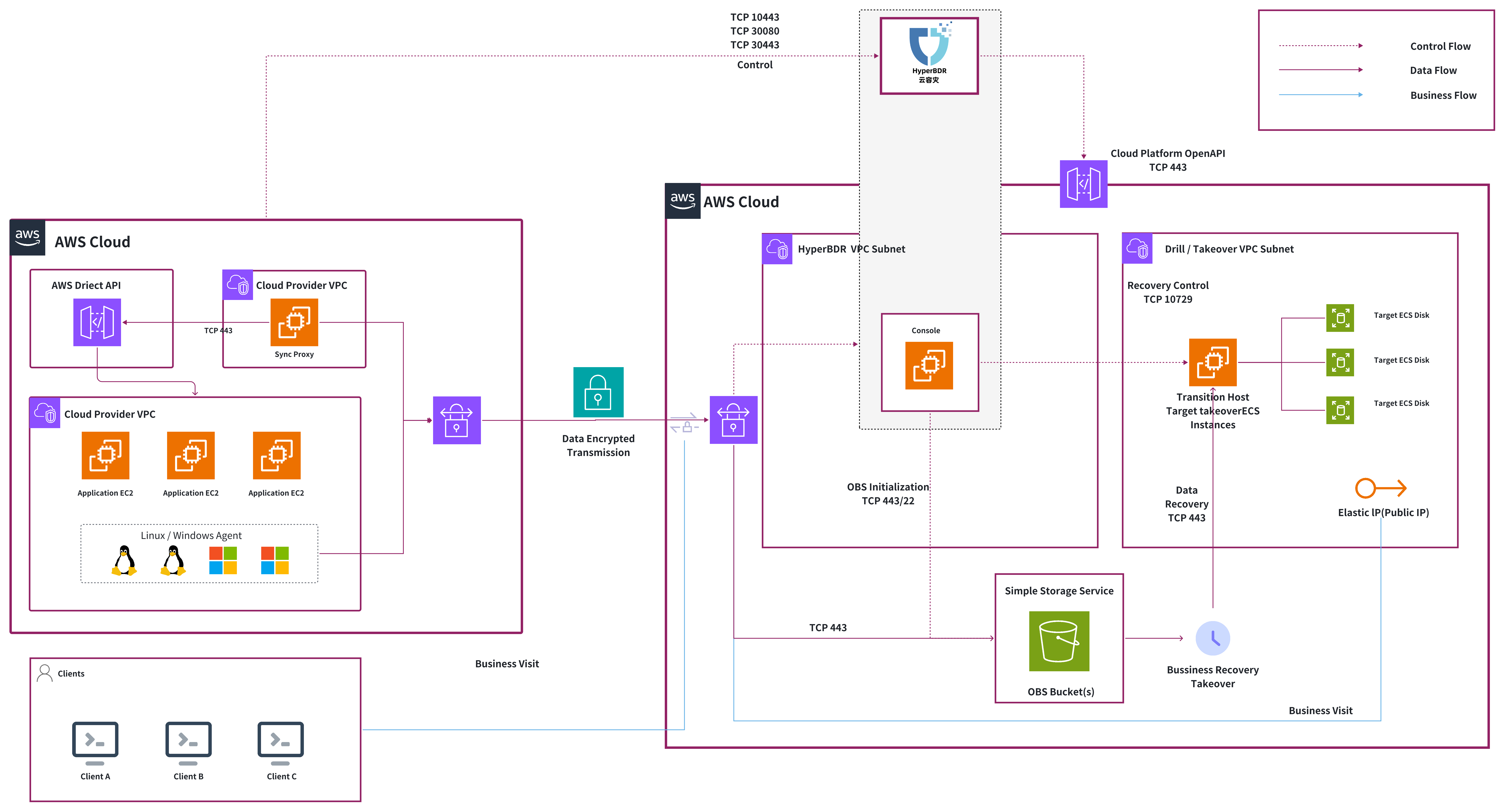 | 控制平面 | HyperBDR 控制平台 | EC2 c6i.2xlarge(8C16G)+ 500 GB EBS | 灾备侧 / 云端 | 集中管理与控制 | 提供统一策略配置、任务调度及灾备接管能力,不直接参与大规模数据传输 |