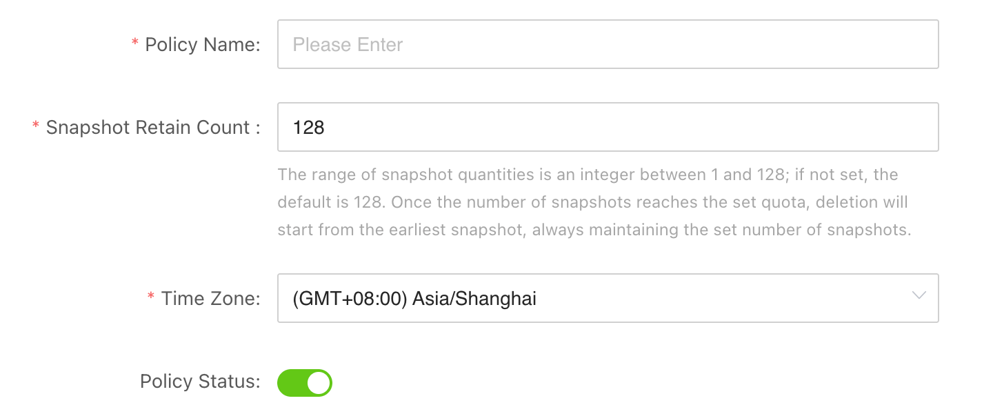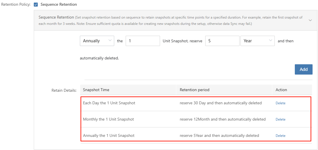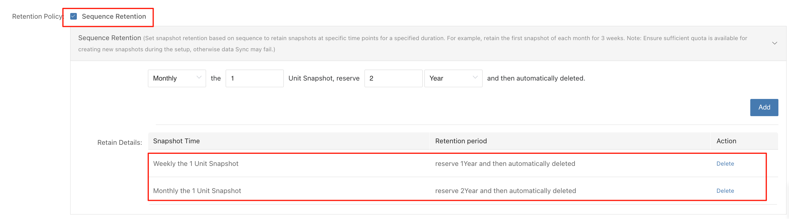 在某些行业中,由于监管要求,需要对特定时间点的快照进行长期保留。此时,可通过配置快照保留策略,实现对这些特殊快照的长期保存。