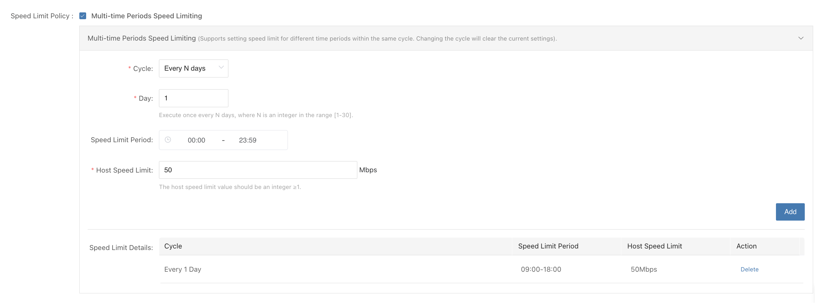 激活限速策略,设定限速时间段为 每天 09:00–18:00。