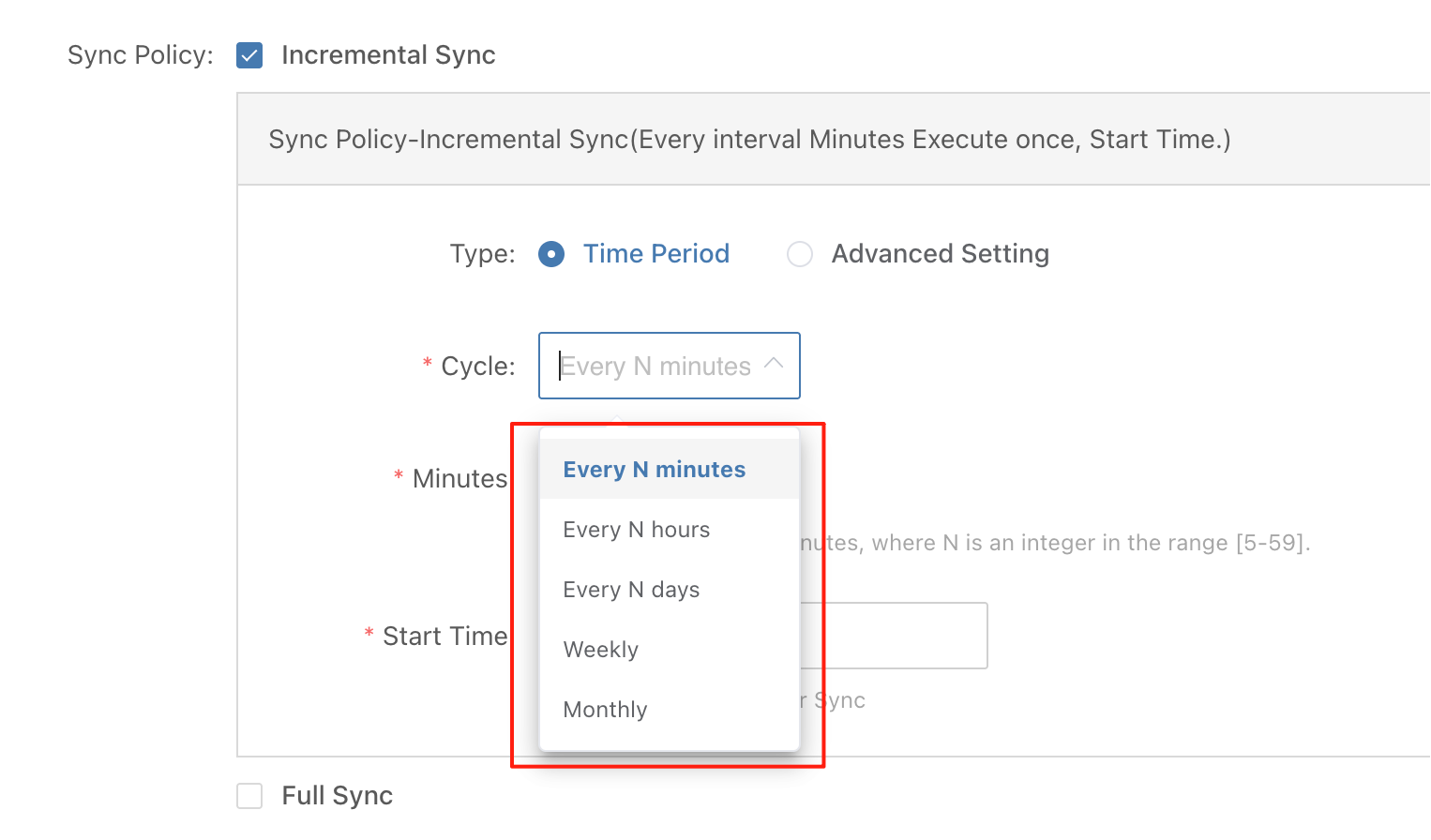 选择固定周期同步模式,支持以分钟(最短5分钟)、小时、天、星期或每月固定时间为单位设置同步间隔。