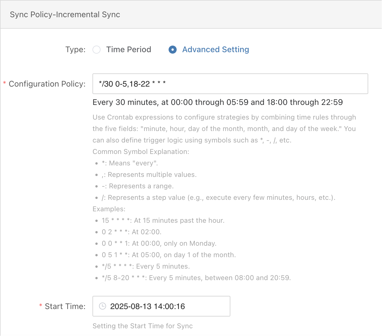 采用 Crontab 模式设置同步任务时间,分两段时间窗口配置同步触发:
