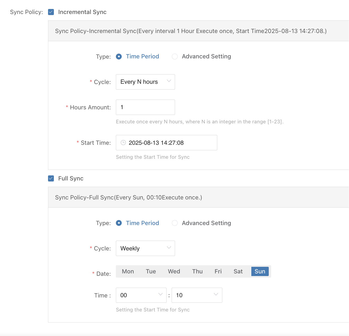 关注全量耗时:全量任务通常耗时较长,应将其开始时间设置早于增量任务,以避免时间冲突导致全量同步无法触发。在本示例中,全量任务设置为每周日 0 点 10 分执行,恰好在增量任务之前,从而确保全量优先执行,且当日增量任务不再触发。